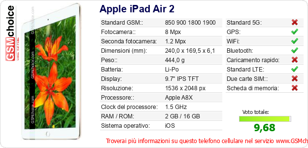 Dati del telefono cellulare Apple iPad Air 2 sul tuo sito