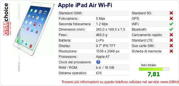 Dati del telefono cellulare Apple iPad Air Wi-Fi sul tuo sito