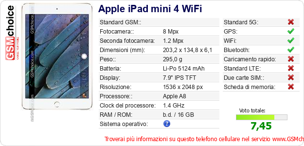 Dati del telefono cellulare Apple iPad mini 4 WiFi sul tuo sito