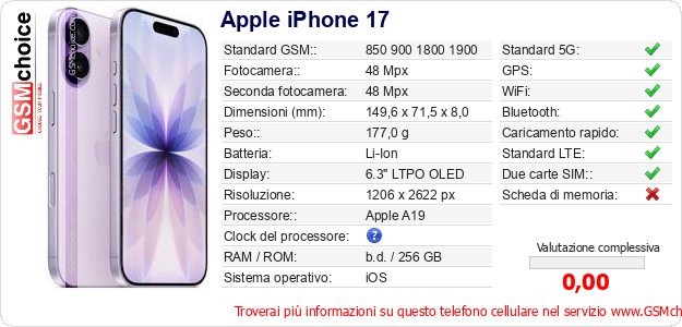 Dati del telefono cellulare Apple iPhone 17 sul tuo sito