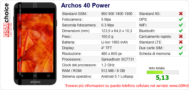 Dati del telefono cellulare Archos 40 Power sul tuo sito