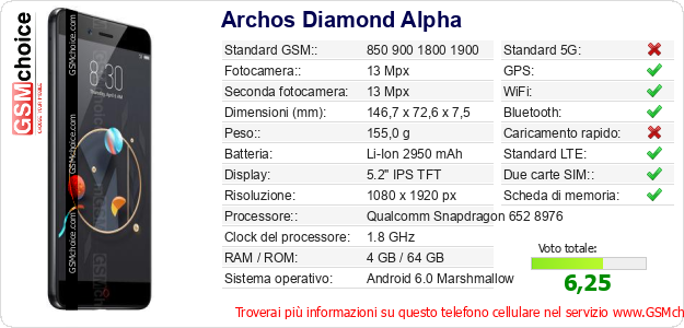 Dati del telefono cellulare Archos Diamond Alpha sul tuo sito