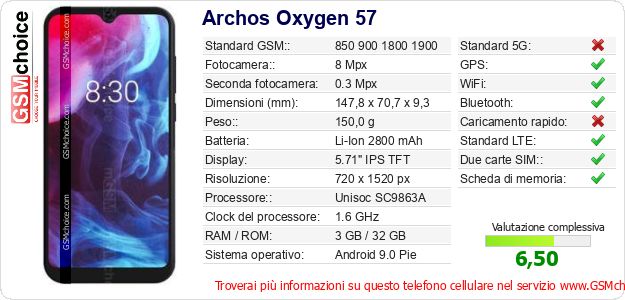Dati del telefono cellulare Archos Oxygen 57 sul tuo sito