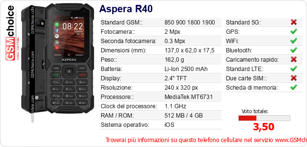 Dati del telefono cellulare Aspera R40 sul tuo sito