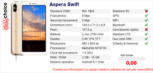 Dati del telefono cellulare Aspera Swift sul tuo sito