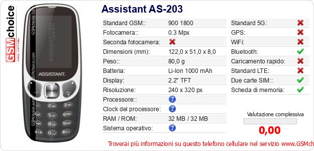 Dati del telefono cellulare Assistant AS-203 sul tuo sito