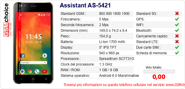 Dati del telefono cellulare Assistant AS-5421 sul tuo sito