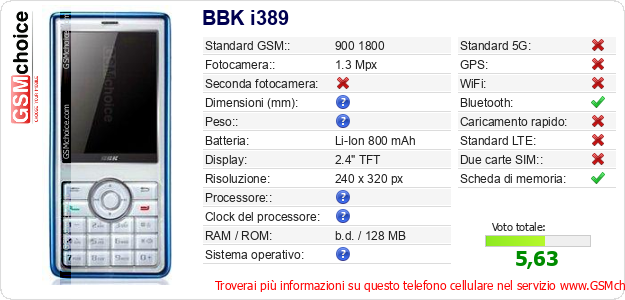 Dati del telefono cellulare BBK i389 sul tuo sito