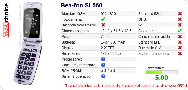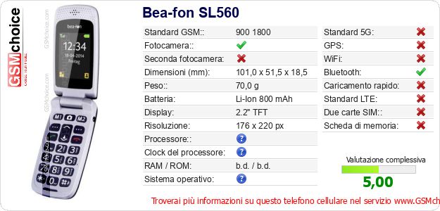 Dati del telefono cellulare Bea-fon SL560 sul tuo sito