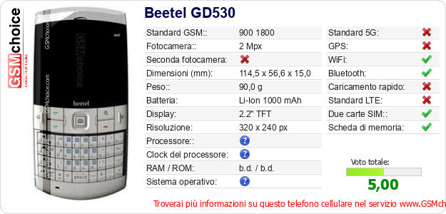 Dati del telefono cellulare Beetel GD530 sul tuo sito