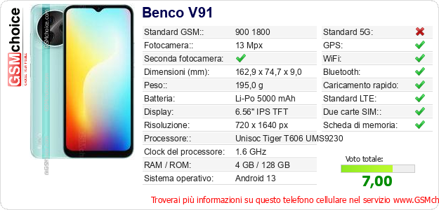 Dati del telefono cellulare Benco V91 sul tuo sito