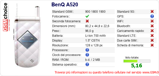 Dati del telefono cellulare BenQ A520 sul tuo sito