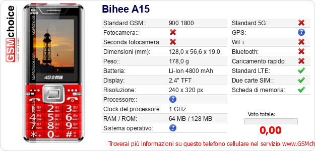 Dati del telefono cellulare Bihee A15 sul tuo sito