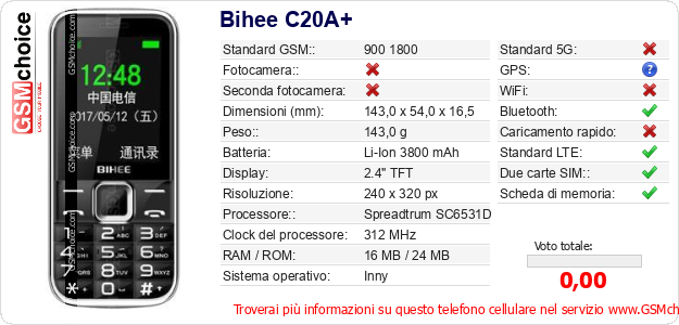 Dati del telefono cellulare Bihee C20A+ sul tuo sito