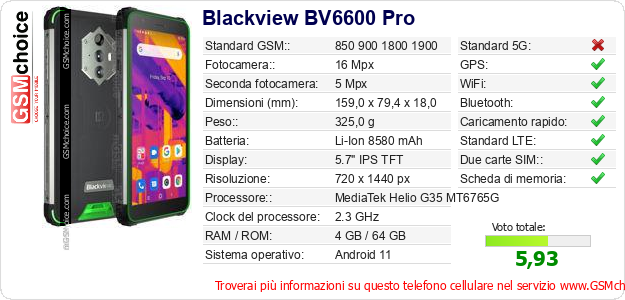 Dati del telefono cellulare Blackview BV6600 Pro sul tuo sito
