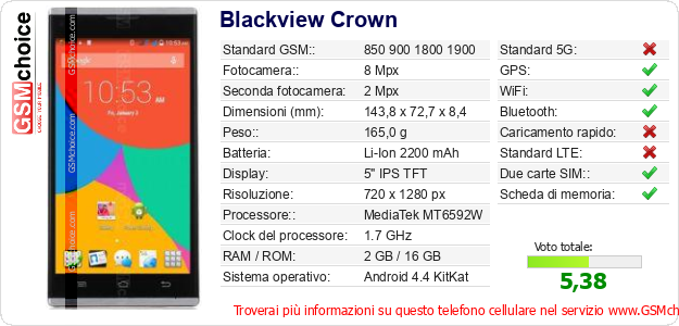 Dati del telefono cellulare Blackview Crown sul tuo sito