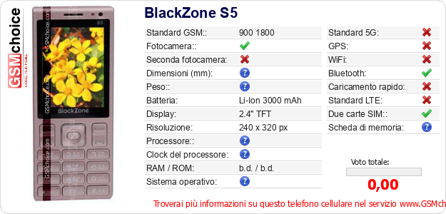 Dati del telefono cellulare BlackZone S5 sul tuo sito