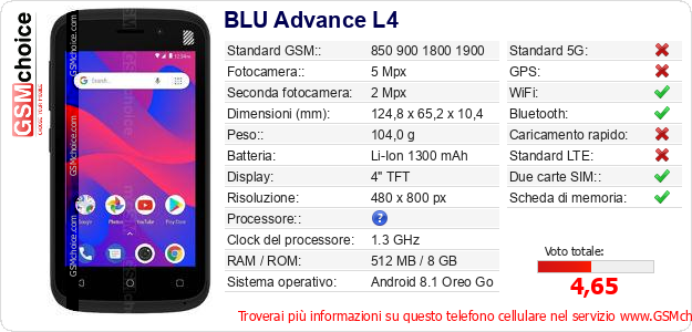 Dati del telefono cellulare BLU Advance L4 sul tuo sito