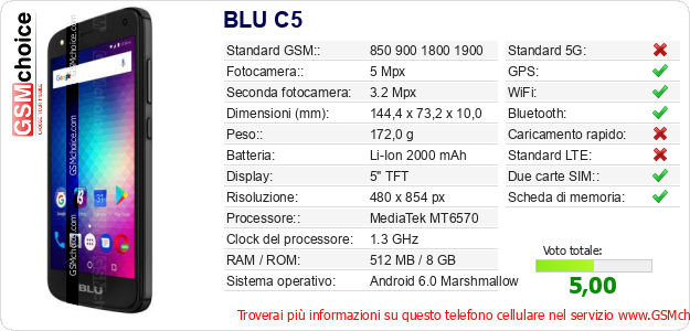Dati del telefono cellulare BLU C5 sul tuo sito