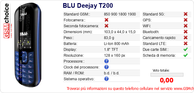 Dati del telefono cellulare BLU Deejay T200 sul tuo sito