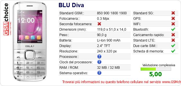 Dati del telefono cellulare BLU Diva sul tuo sito