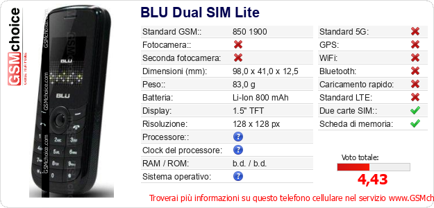 Dati del telefono cellulare BLU Dual SIM Lite sul tuo sito