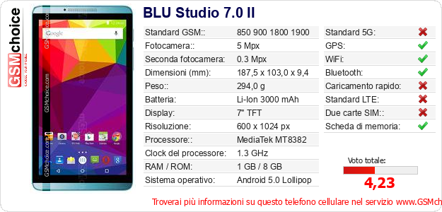 Dati del telefono cellulare BLU Studio 7.0 II sul tuo sito