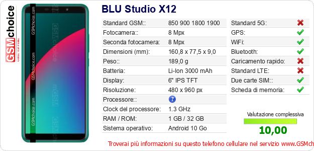 Dati del telefono cellulare BLU Studio X12 sul tuo sito