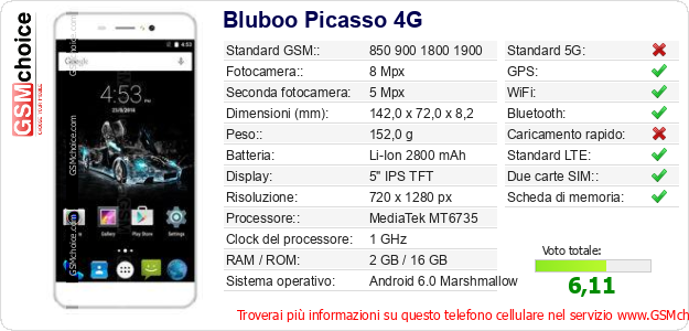 Dati del telefono cellulare Bluboo Picasso 4G sul tuo sito