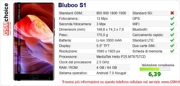 Dati del telefono cellulare Bluboo S1 sul tuo sito