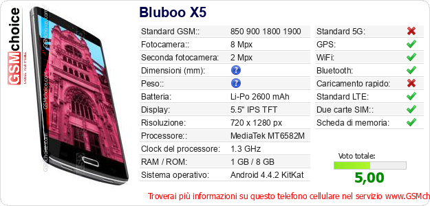 Dati del telefono cellulare Bluboo X5 sul tuo sito