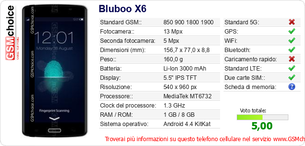 Dati del telefono cellulare Bluboo X6 sul tuo sito