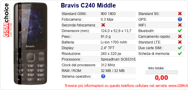 Dati del telefono cellulare Bravis C240 Middle sul tuo sito