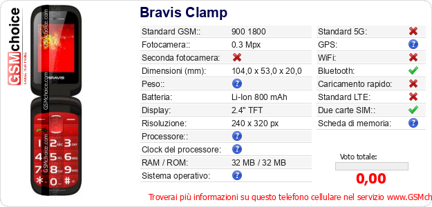 Dati del telefono cellulare Bravis Clamp sul tuo sito
