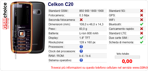 Dati del telefono cellulare Celkon C20 sul tuo sito