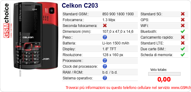 Dati del telefono cellulare Celkon C203 sul tuo sito