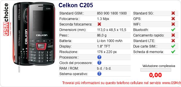 Dati del telefono cellulare Celkon C205 sul tuo sito