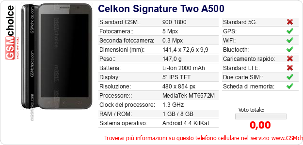 Dati del telefono cellulare Celkon Signature Two A500 sul tuo sito