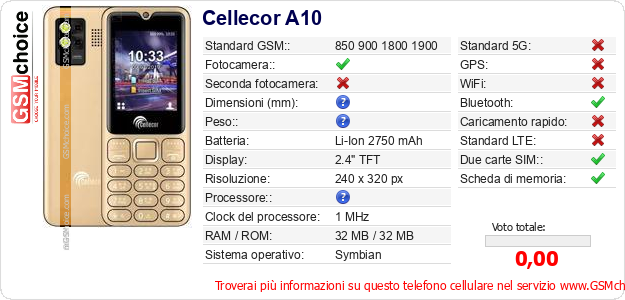 Dati del telefono cellulare Cellecor A10 sul tuo sito