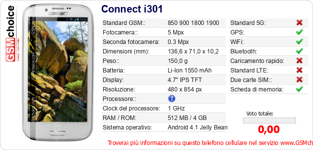 Dati del telefono cellulare Connect i301 sul tuo sito