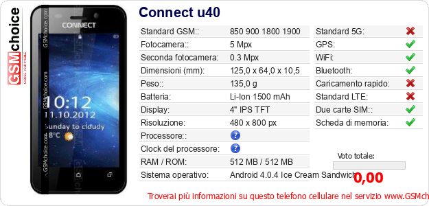 Dati del telefono cellulare Connect u40 sul tuo sito