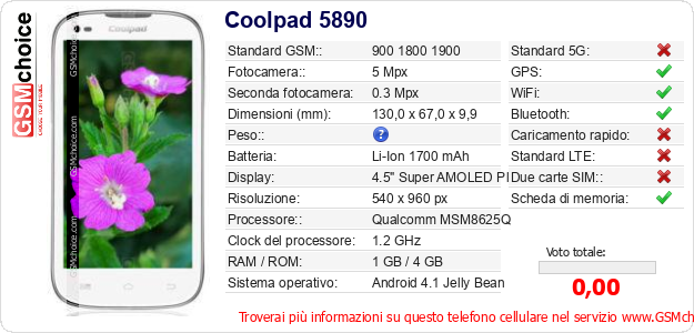 Dati del telefono cellulare Coolpad 5890 sul tuo sito