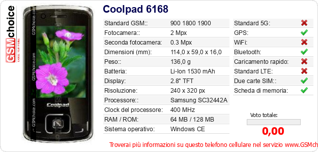 Dati del telefono cellulare Coolpad 6168 sul tuo sito