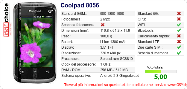 Dati del telefono cellulare Coolpad 8056 sul tuo sito