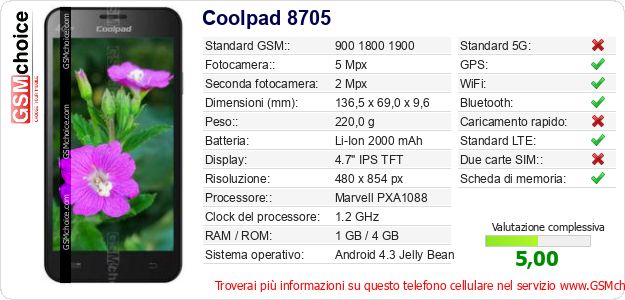 Dati del telefono cellulare Coolpad 8705 sul tuo sito
