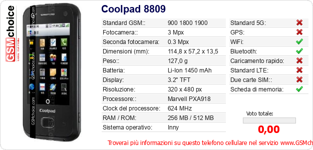 Dati del telefono cellulare Coolpad 8809 sul tuo sito