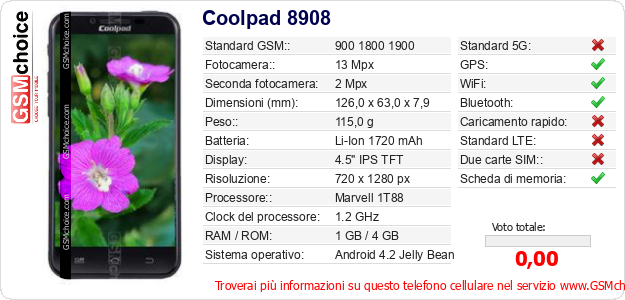 Dati del telefono cellulare Coolpad 8908 sul tuo sito