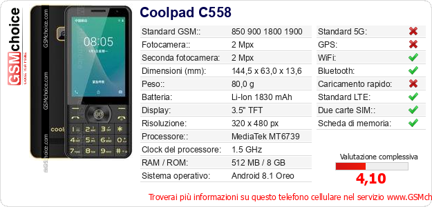 Dati del telefono cellulare Coolpad C558 sul tuo sito
