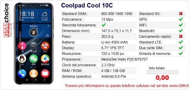 Dati del telefono cellulare Coolpad Cool 10C sul tuo sito