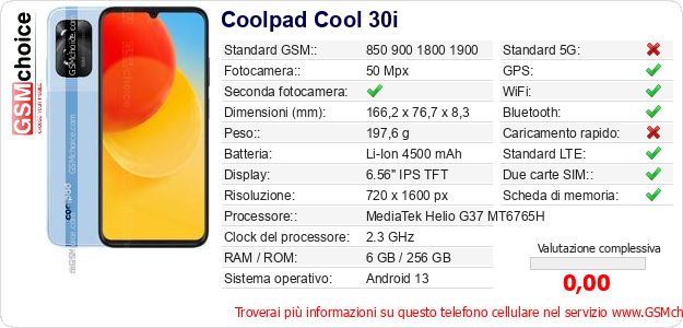 Dati del telefono cellulare Coolpad Cool 30i sul tuo sito